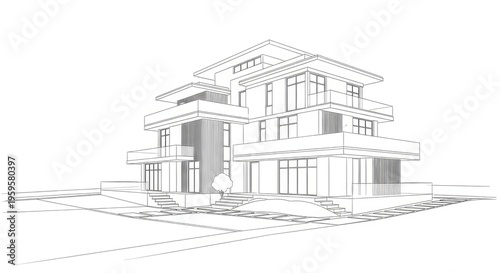architecture, building, house, residential, modern, design, vignetting, line art, drawing, illustration, structure, exterior, perspective, blueprint, construction, property, real estate, contemporary, monochrome, isolated, white background, render, urban, geometric, concept, project, detailed, view, facades, graphic, art, creative, style, plan, elevation, development, visualisation, minimalist, abstract, shape, shadow, light, angle, composition, template, copy space, commercial, editorial