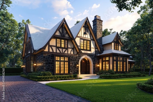 Architectural visualization of a home with honey gold accents, traditional style, dark limestone and oak details, vast windows, linen roof trim, a brick driveway, and lush green grass