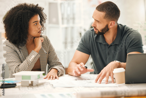 Architecture, discussion and documents with business people in office together for building or construction. Blueprints, model or planning with serious man and woman property developer team at work