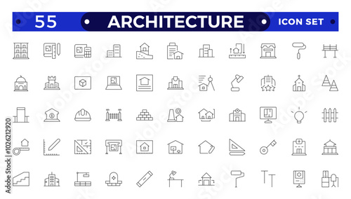 Architecture line icons collection. Bank, temple, office, factory, shop, hotel, hospital icons. UI icon set. Apartment interior blueprint. House construction.