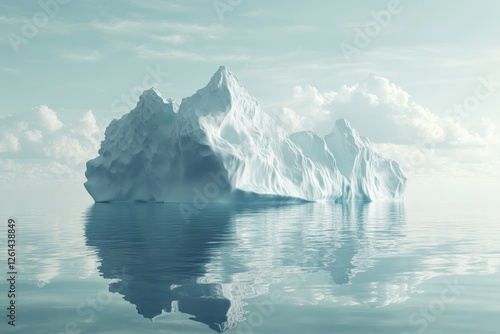 Arctic iceberg floats, ocean reflection, cloudy sky, climate change