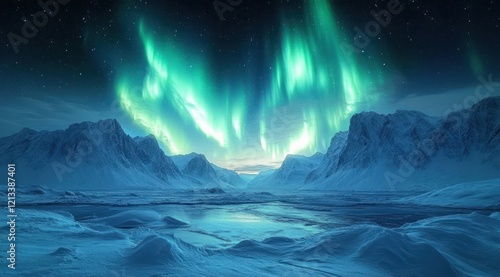 Arctic Landscape with Northern Lights and Snow-Covered Mountains Icebergs Tundra Night Sky