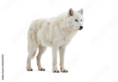 Arctic wolf standing alert with thick white fur on a stark white background in a studio setting