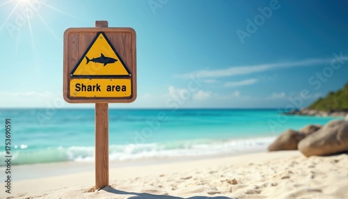 area warning yellow sign on ocean beach sand. Sunny day with azure water. Summer vacation travel. Marine wildlife dangerous predators alert on coast. Safety precaution for swimmers protection.