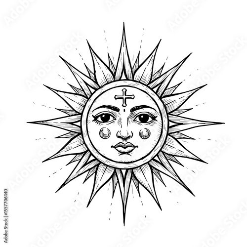Argentinian Independence Day sun illustration. Symbolic sun with face and cross. Patagonian sun graphic design for patriotic celebrations.