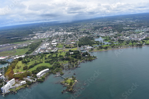 Arial view of Hilo Hawaii from above the clouds. Tourism showing the city from a helicopter