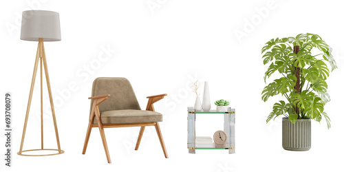 Armchair and accessories decor on transparent background.3d rendering