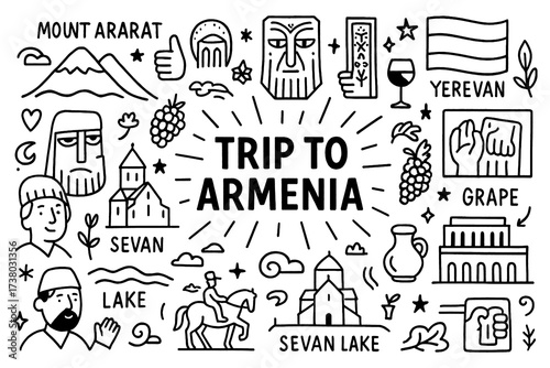 armenia, doodle, culture, tradition, heritage, cascade, landmark, architecture, food, pomegranate, wine, jug, music, lira, cross, christianity, history, people, man, travel, tour tourism, holiday, folklore, national, identity, celebration, community, lifestyle, historical building, nature, simple, fun, cartoon, vignetting, black-and-white, outline, sticker, isolated, design, element, symbol
