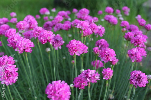 Armeria maritima, sea thrift, pink flowers bloom in the morning sunlight