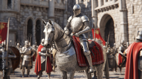 Armored knight on horse in castle courtyard, surrounded by soldiers, exuding strength and valor in medieval setting