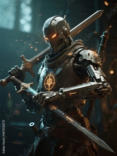 Armored Knight with Futuristic Weapons and Glowing Eyes