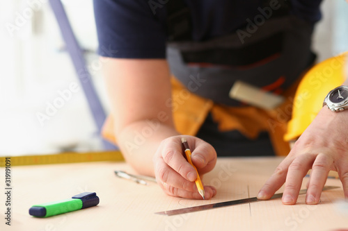 Arms of worker making structure plan on scaled paper closeup. Manual job DIY inspiration improvement job fix shop graphic joinery startup workplace idea designer career industrial education