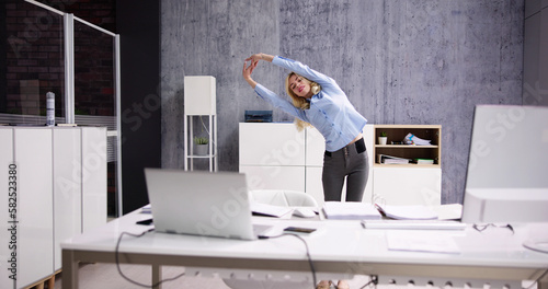 office, stretch, exercise, desk, stretching, sport, standing, racked, front, laptop, sitting, arm, physical exercise, us, at, map, doing, in, business, woman, the, bird, company, fit, manager, workplace, health, corporate, electronic, woman