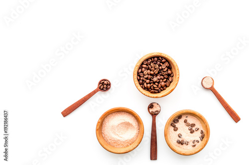 Aromatheraphy in spa. Chocolate brown spa salt on white background top view copy space