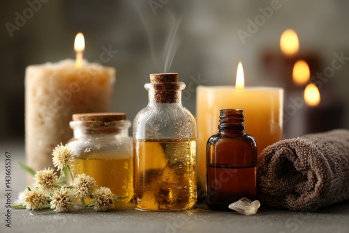 Aromatherapy still life with essential oil bottles, burning candles, flowers, a quartz crystal, and a rolled towel for wellness