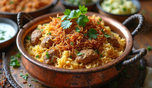 Aromatic Biryani with Meatballs in a Copper Bowl