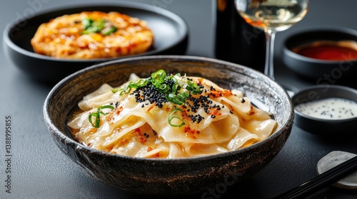 Aromatic Bowl of Delicious Cuisine Accompanied by Elegant Wine Glass
