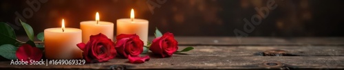 Aromatic candles & roses burn on rustic wood Copy space , flower, table, wood