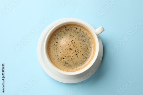 Aromatic coffee in cup on light blue background, top view
