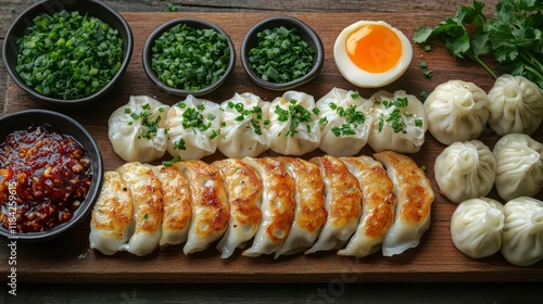 dumpling, steamed, boiled, sauce, scallion, egg, cookery, food, delicious, tasty, asian, chinese, japanese, korean, dinner, lunch, meal, plate, wooden, board, arrangement, variety, savoury, comfort, culinary, gastronomy, favor, texture, aroma, presentation, photo, still life, composition, closeup, appetising, satisfying, epicure, eatery, menu