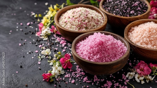 sea salt, wellness, beauty, relaxation, aromatherapy, flower, flower petals, dark background, closeup, topview, texture, colourful, vibrant, luxurious, fragrant, natural