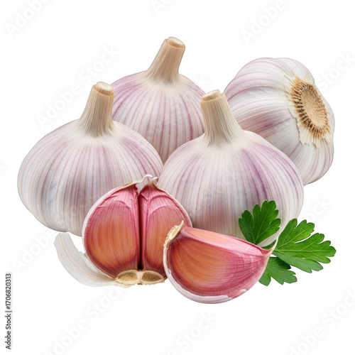 garlic, bulb, clove, parsley, aromatic, favor, culinary, still, life, ingredient, cooking, healthy, eating, epicure, transparent, background, herb, spice, food, fresh, plant, vegetable, closeup, macro, detail, nourishment, diet, raw, organic, natural, white, purple, green, isolated, studio, shot, image, photo, produce, vegetarian, vegan, condiment, seasoning, aroma, fragrant, pungent, flavorful, delicious