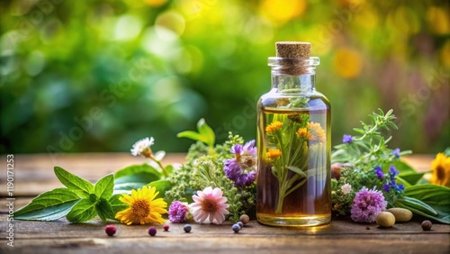 Aromatic herbs and flowers arranged in a decorative bottle with essential oils, oil, natural remedies