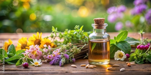 Aromatic herbs and flowers surrounding a glass bottle with essential oil on a wooden table, natural ingredients, aromatherapy