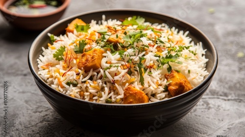 Aromatic Indian biryani with saffron rice, served elegantly, studio lighting, isolated background