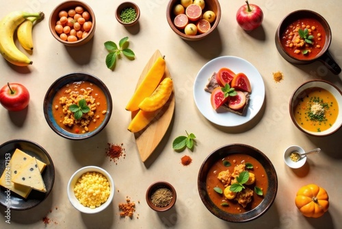 Aromatic Spiced Soups, Fresh Fruits, and Savory Bites Arranged for a Vibrant Culinary Display