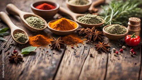 Aromatic spices and herbs on rustic wooden table. (1)