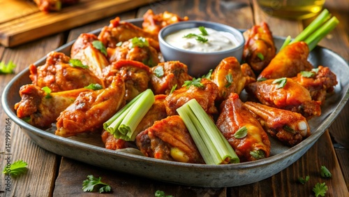 Aromatic Spicy Chicken Wings with Creamy Dip and Celery Sticks on Rustic Wooden Table