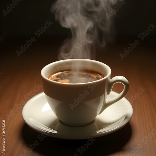 hot drink, cup, mug, hot, steam, drink, beverage, caffeinated, morning, breakfast, espresso, dark, brown, wooden, table, surface, delicious, aroma, fragrance, comfort, warm, cosy, relaxing, energy, stimulant, caffeine, hot drink, white cup, saucer, dark background, still life, food photography, closeup, coffee break