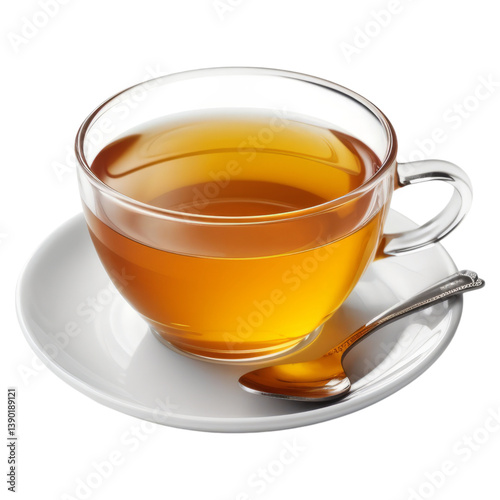 Aromatic tea in glass cup : A transparent glass cup filled with golden tea, delicately placed on a pristine saucer with a shiny spoon.