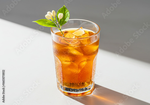 cold drink, refreshing, beverage, tea, drink, ice, condensation, glasses, white flower, green leaf, herbal tea, cooling, hydratation, aroma, fragrant, chilled, golden brown, liquid, transparent, still life, studio shot, bright light, shadow, white background, natural, fresh, tea leaf, bud, food photography, cafe drink, traditional, detox, wellness