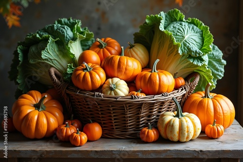 Arrange seasonal vegetables like squash, pumpkins, and cabbage in a still life. Soft, warm lighting enhances the textures and colors, evoking a cozy, autumnal feel perfect for a rustic, seasonal displ