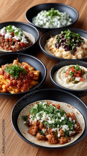 Arranged Dishes Featuring Tacos and Various Accompaniments in Black Bowls on Wooden Surface