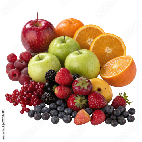 Arrangement of assorted fresh fruits including apples, grapes, oranges, and bananas, colorful composition symbolizing healthy diet and natural nutrition. PNG