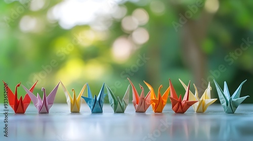 Arrangement of Delicately Folded Origami Paper Cranes in Soothing Pastel Colors Displayed as a Tranquil Symbol of Peace and Harmony