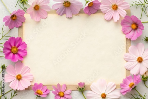 Arranging fresh cosmos flowers around handmade pastel paper in an artistic flat lay setting