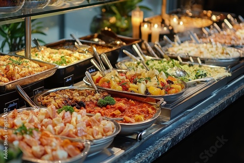 Array of colorful dishes displayed at a buffet during a lively event in an upscale venue