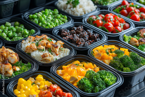 Array of meal prep containers with healthy ingredients, appealing to readers interested in balanced, portioned meals, Food photography