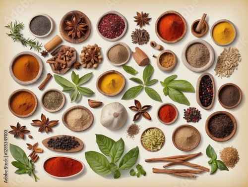 spice, herb, bowl, wooden, culinary, cooking, favor, aroma, seasoning, food, ingredient, basil, rosemary, cinnamon, pepper, chili, turmeric, paprika, ginger, garlic, oregano, seed, powder, grain, nut, peppercorn, clove, dill, mustard, coriander, cardamon, cumin, sage, parsley, thyme, fennel, saffron, vanilla, anise, salt, curry, flake, cayenne, assortment