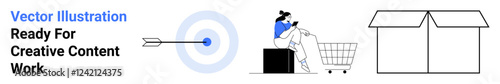 Arrow hitting target, person with shopping cart on laptop, and open box represent marketing goals, e-commerce, productivity. Ideal for business, strategy, retail, logistics goal setting minimal