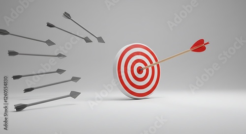 arrow, hitting, target, missing, bullseye, accuracy, precise, dart, aiming, achieving, success, bankruptcy, goal, competition, challenge, strategy, planning, execution, business, marketing, concept, illustration, minimal, white background, studio, isolate, objective, sharpened, skill, endeavour, effort, striving, determined, resolve, persistence, determination, missed, red, white, grey, three-dimensional