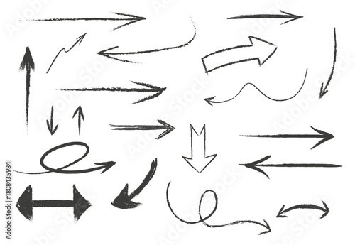 Arrow vector line set. Charcoal hand drawn pencil arrows. Doodle curved chalk darts. brush sketch arrow line curve up, down shape chalk texture element set. Abstract grunge scribble chalk crayon style
