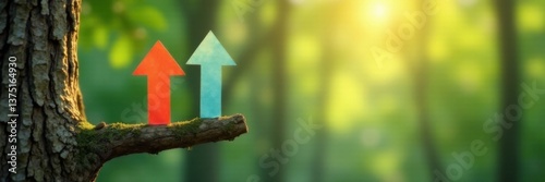 Arrows made of paper on a tree branch, one pointing up the other down , natural directional signs, upward downward contrast, branching paths