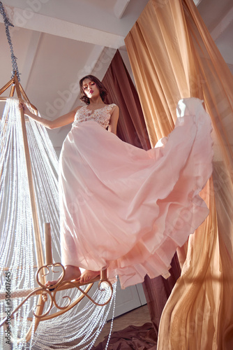 Art beauty woman in long beige pink dress dances and spins on large crystal chandelier in center of hall. Fantasy Fashion woman in a light summer dress