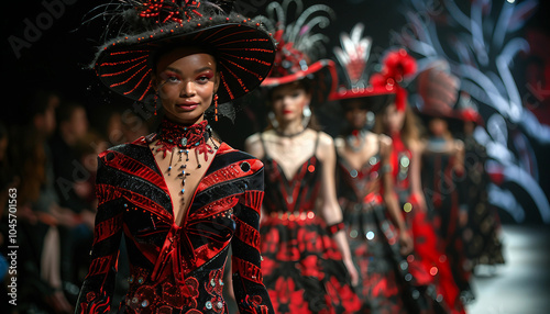 Art Deco Inspired Fashion Show, runway scene showcasing models in high-fashion outfits that blend modern trends with Art Deco aesthetics.
