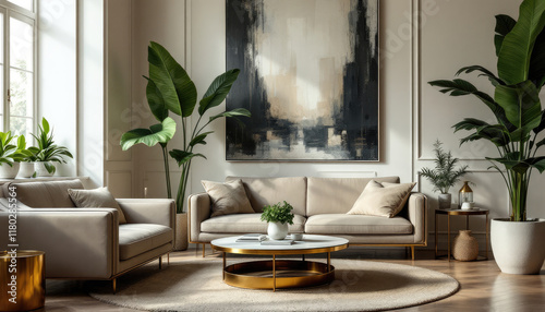 Art deco interor living room with a large painting on the wall, two beige sofas, a coffee table, and several potted plants.